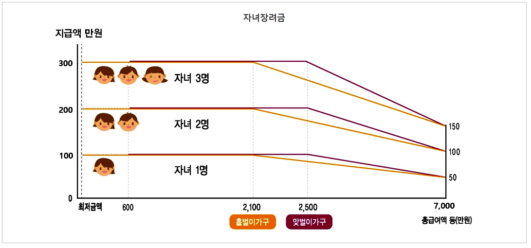 A: 자녀장려금은 부부합산 총소득과 자녀 수에 따라 결정됩니다. 자녀 1인당 최대 70만원까지 지급 가능하며, 총소득이 증가할수록 자녀 1인당 지급액은 감소합니다.